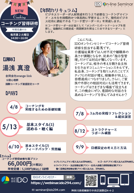 みなさまこんにちは。IDOオンラインセミナーでコーチング習得研修を担当させていただきます、