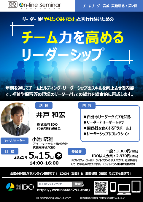 | 参加料 | ●一般:3,300円(税込) ●IDO法人会員:2,970円(税込) ※登録無料 https://ido294.com/houjinkaiin/ ●プレミアム・ゴールドプラン契約法人:追加費用なくご登録職員は全研修をご利用いただけます(特別企画研修を除く) ●ライトプラン契約法人:追加費用なくご登録職員は全研修をご利用いただけます(回数制限あり) |