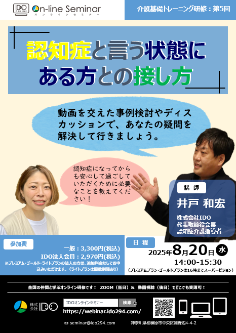 | 参加料 | ●一般:3,300円(税込) ●IDO法人会員:2,970円(税込) ※登録無料 https://ido294.com/houjinkaiin/ ●プレミアム・ゴールドプラン契約法人:追加費用なくご登録職員は全研修をご利用いただけます(特別企画研修を除く) ●ライトプラン契約法人:追加費用なくご登録職員は全研修をご利用いただけます(回数制限あり) |