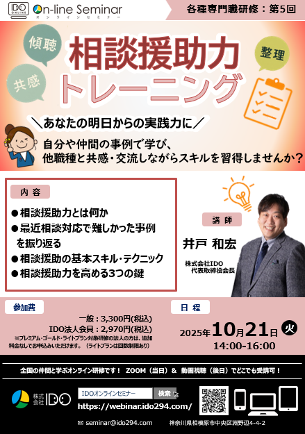 | 参加料 | ●一般:3,300円(税込) ●IDO法人会員:2,970円(税込) ※登録無料 https://ido294.com/houjinkaiin/ ●プレミアム・ゴールドプラン契約法人:追加費用なくご登録職員は全研修をご利用いただけます(特別企画研修を除く) ●ライトプラン契約法人:追加費用なくご登録職員は全研修をご利用いただけます(回数制限あり) |