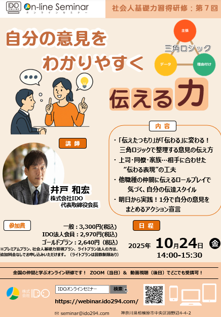 | 参加料 | ●一般:3,300円(税込) ●IDO法人会員:2,970円(税込) ※登録無料 https://ido294.com/houjinkaiin/ ●ゴールドプラン契約法人:2,640円(税込) ●プレミアムプラン・社会人基礎力習得プラン契約法人:追加費用なくご登録職員は全研修をご利用いただけます(特別企画研修を除く) ●ライトプラン契約法人:追加費用なくご登録職員は全研修をご利用いただけます(回数制限あり) |
