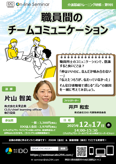| 参加料 | ●一般:3,300円(税込) ●IDO法人会員:2,970円(税込) ※登録無料 https://ido294.com/houjinkaiin/ ●プレミアム・ゴールドプラン契約法人:追加費用なくご登録職員は全研修をご利用いただけます(特別企画研修を除く) ●ライトプラン契約法人:追加費用なくご登録職員は全研修をご利用いただけます(回数制限あり) |