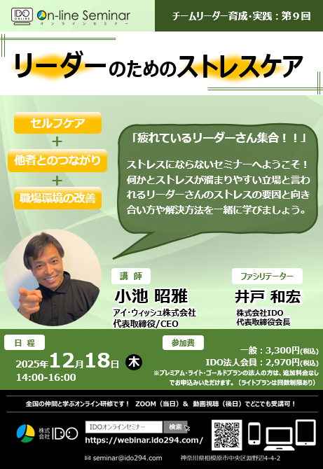 | 参加料 | ●一般:3,300円(税込) ●IDO法人会員:2,970円(税込) ※登録無料 https://ido294.com/houjinkaiin/ ●プレミアム・ゴールドプラン契約法人:追加費用なくご登録職員は全研修をご利用いただけます(特別企画研修を除く) ●ライトプラン契約法人:追加費用なくご登録職員は全研修をご利用いただけます(回数制限あり) |