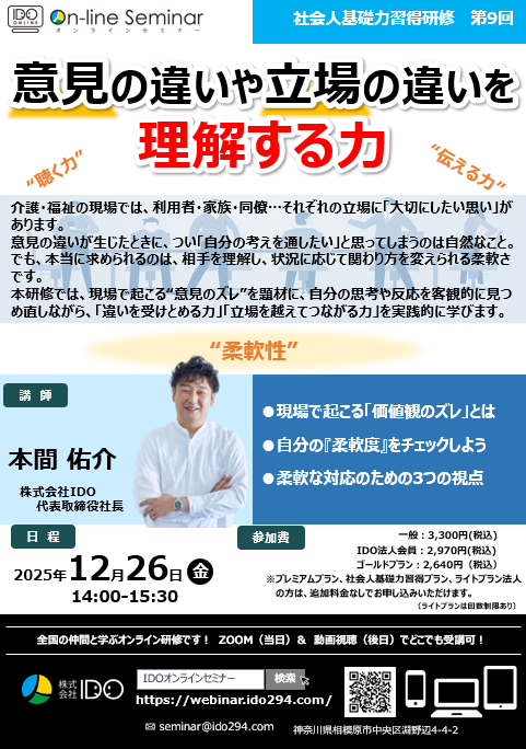 | 参加料 | ●一般:3,300円(税込) ●IDO法人会員:2,970円(税込) ※登録無料 https://ido294.com/houjinkaiin/ ●ゴールドプラン契約法人:2,640円(税込) ●プレミアムプラン・社会人基礎力習得プラン契約法人:追加費用なくご登録職員は全研修をご利用いただけます(特別企画研修を除く) ●ライトプラン契約法人:追加費用なくご登録職員は全研修をご利用いただけます(回数制限あり) |