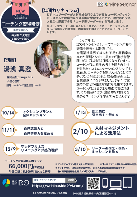 | プログラム | コーチング習得研修 第1回 コーチングを実践するための基礎知識 第2回 基本スタイル(1)認める・聴く編 第3回 基本スタイル(2)フィードバック・質問編 第4回 3ヵ月の実践リフレクション&総括演習 第5回 ストラクチャーとラポール構築 第6回 目標設定の考え方と方法 第7回 アクションプランと全体セッション 第8回 自己認識力と自己管理力を高める 第9回 マインドフルネスリスニングと共感的理解 第10回 効果的に引き出す・伝える 第11回 人材マネジメントによる活用法 第12回 リーダーの信念・信条・ミッションを作る ※単回でのご参加もOKです。 ※タイトルや内容は変更されることもあります。 ※毎月第2火曜日 |