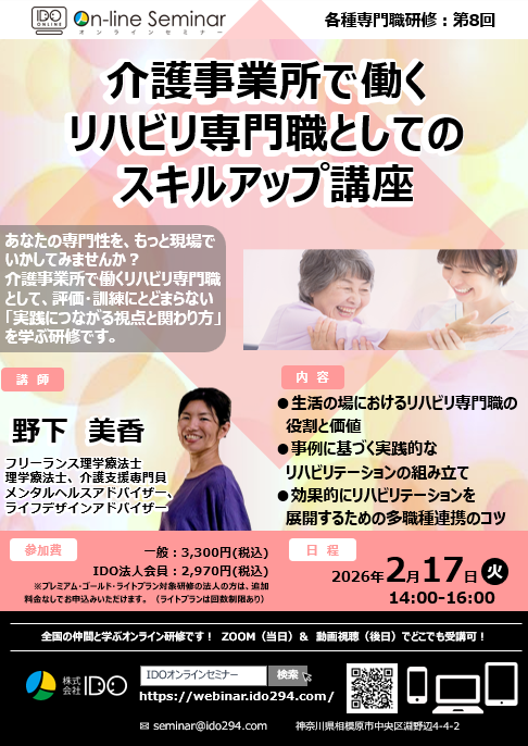 | 参加料 | ●一般:3,300円(税込) ●IDO法人会員:2,970円(税込) ※登録無料 https://ido294.com/houjinkaiin/ ●プレミアム・ゴールドプラン契約法人:追加費用なくご登録職員は全研修をご利用いただけます(特別企画研修を除く) ●ライトプラン契約法人:追加費用なくご登録職員は全研修をご利用いただけます(回数制限あり) |