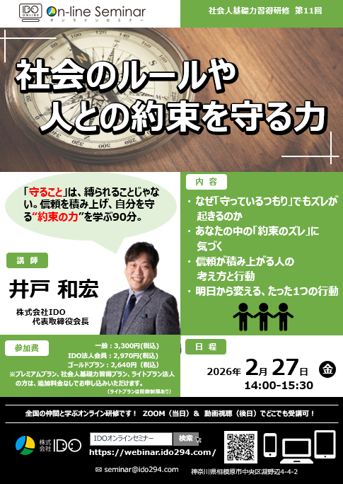 | 参加料 | ●一般:3,300円(税込) ●IDO法人会員:2,970円(税込) ※登録無料 https://ido294.com/houjinkaiin/ ●ゴールドプラン契約法人:2,640円(税込) ●プレミアムプラン・社会人基礎力習得プラン契約法人:追加費用なくご登録職員は全研修をご利用いただけます(特別企画研修を除く) ●ライトプラン契約法人:追加費用なくご登録職員は全研修をご利用いただけます(回数制限あり) |