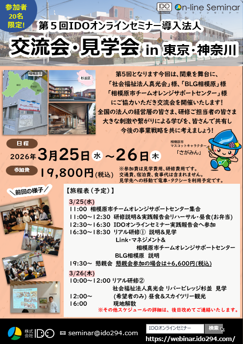 | プログラム | 【スケジュール】※変更があった場合は随時更新致します。 <1日目> 3/25(水) 11:00 相模原市チームオレンジサポートセンター集合 11:00〜12:30 研修説明&実践報告会リハーサル・昼食(お弁当) 12:30〜16:30 IDOオンラインセミナー実践報告会へ参加 16:30〜18:30 リアル研修① 説明&見学 Link・マネジメント& 相模原市チームオレンジサポートセンター BLG相模原 説明 19:30〜 懇親会 懇親会参加の場合は+6,600円(税込) <2日目> ・3/26(木) 10:00〜12:00 リアル研修② 社会福祉法人真光会 リバービレッジ杉並 見学 12:00〜 (希望者のみ) 昼食&スカイツリー観光 16:00 現地解散 |