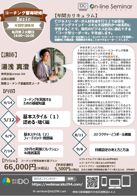 IDOオンラインセミナーでコーチング習得研修を担当させていただきます、IDOパートナーコーチの湯浅です。