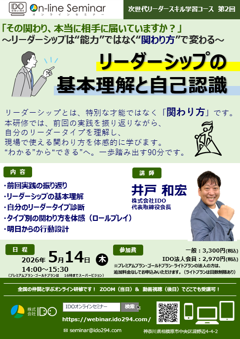 | プログラム | 次世代リーダースキル学習コース 第1回 法人理念・行動指針の実践理解 第2回 リーダーシップの基本理解と自己認識 第3回 聴く力:信頼を生むコミュニケーションの基本 第4回 伝える力:意図を正しく届ける表現技術 第5回 チームワークと協働の促進 第6回 課題発見と問題解決の基礎 第7回 仕事の進め方と段取り力 第8回 後輩育成・OJTの基本 第9回 モチベーションと主体性の引き出し方 第10回 ストレスマネジメントとセルフケア 第11回 リスクマネジメントと報告の重要性 第12回 学びの振り返りと次年度に向けた目標設定 ※単回でのご参加もOKです。 ※タイトルや内容は変更されることもあります。 ※毎月第2木曜日 |