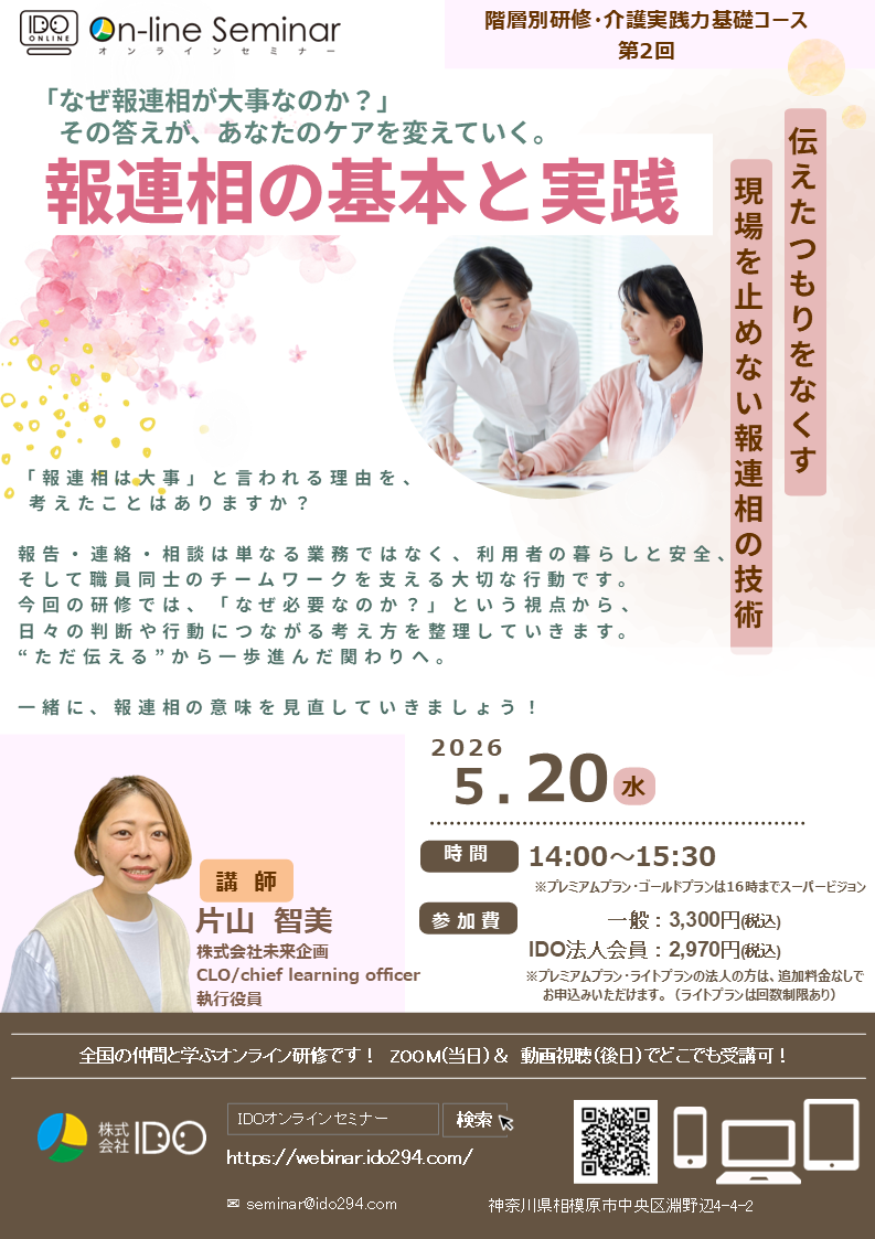 報連相や観察力、チーム連携、介助技術、家族理解など、介護の基礎を総合的に学び、日々の支援の質を高めることを目的とします。